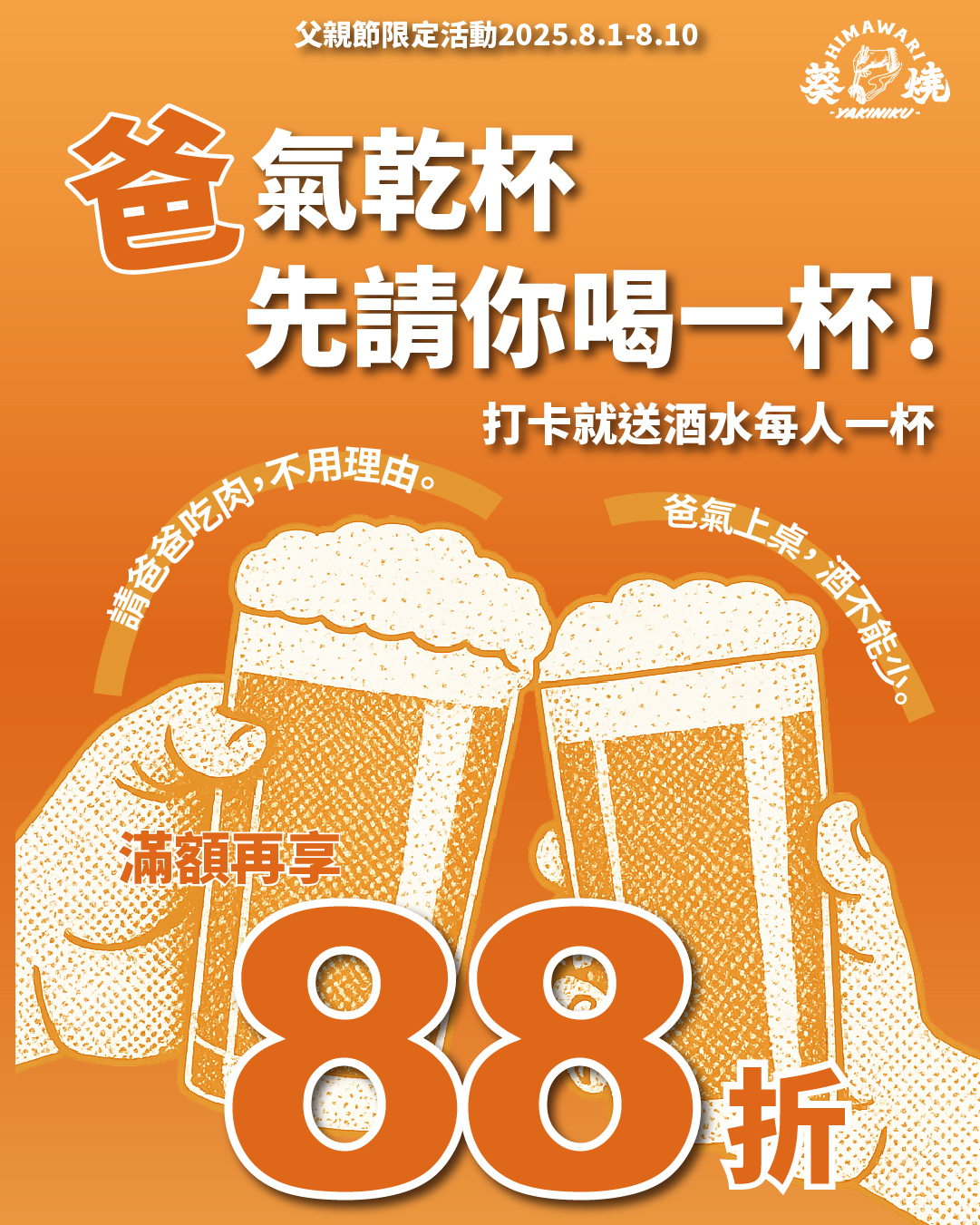 爸氣乾杯・先請你喝一杯!父親節就該吃好一點、喝爽一點! 今年帶爸爸來葵燒,我們請你喝、再幫你打折!🎁 活動優惠一次看: 📸 打卡即送每人飲品一杯(酒精/非酒精皆可) 💰 滿3999元,再享全單88折不只誠意滿分,CP值也超標🔥 一桌好肉+一杯敬爸,今年的父親節就選葵燒!*每人贈送一杯130元內飲品,可補差額升級。 *單筆消費滿3999元(不含服務費),再享全單88折,不與其他優惠併用。 📅 活動期間:8/1~8/10 📍 葵燒燒肉 HIMAWARI 📞 訂位專線:(02) 2366-0888 #父親節優惠 #葵燒燒肉 #爸氣登場 #打卡送飲品 #88開烤