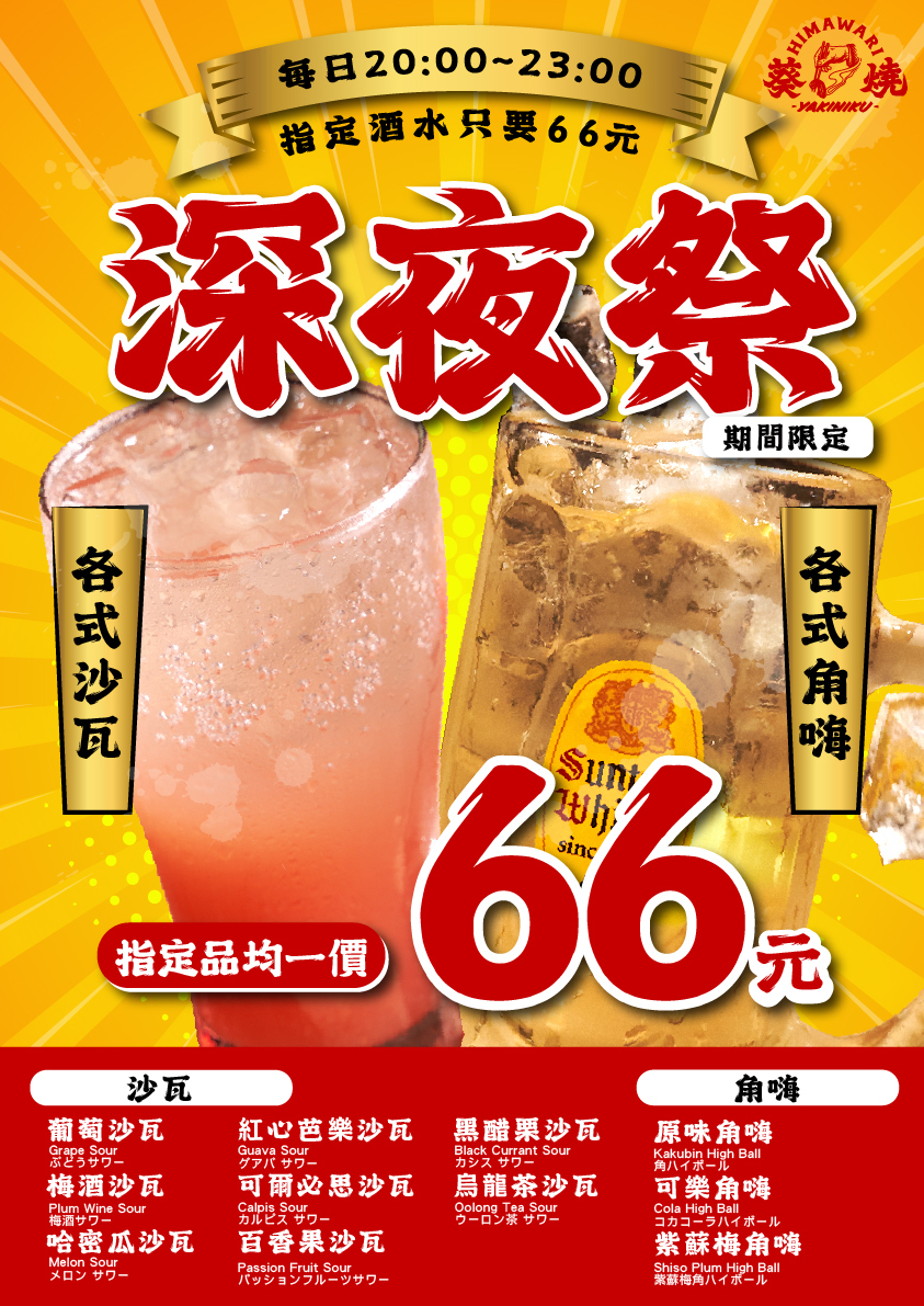 當大部分餐廳準備打烊,葵燒的夜才正要開始。深夜的炭火、酒香與笑聲,是屬於「深夜祭」的溫度。每天晚上 20:00~23:00,我們準備了限定活動——指定酒水均一價 66 元!不論你喜歡果香沙瓦還是清爽角嗨,都能在這裡找到最對味的一杯。烤肉的滋滋聲、朋友的乾杯聲、那一刻的微醺與放鬆,就是一天最好的結尾。