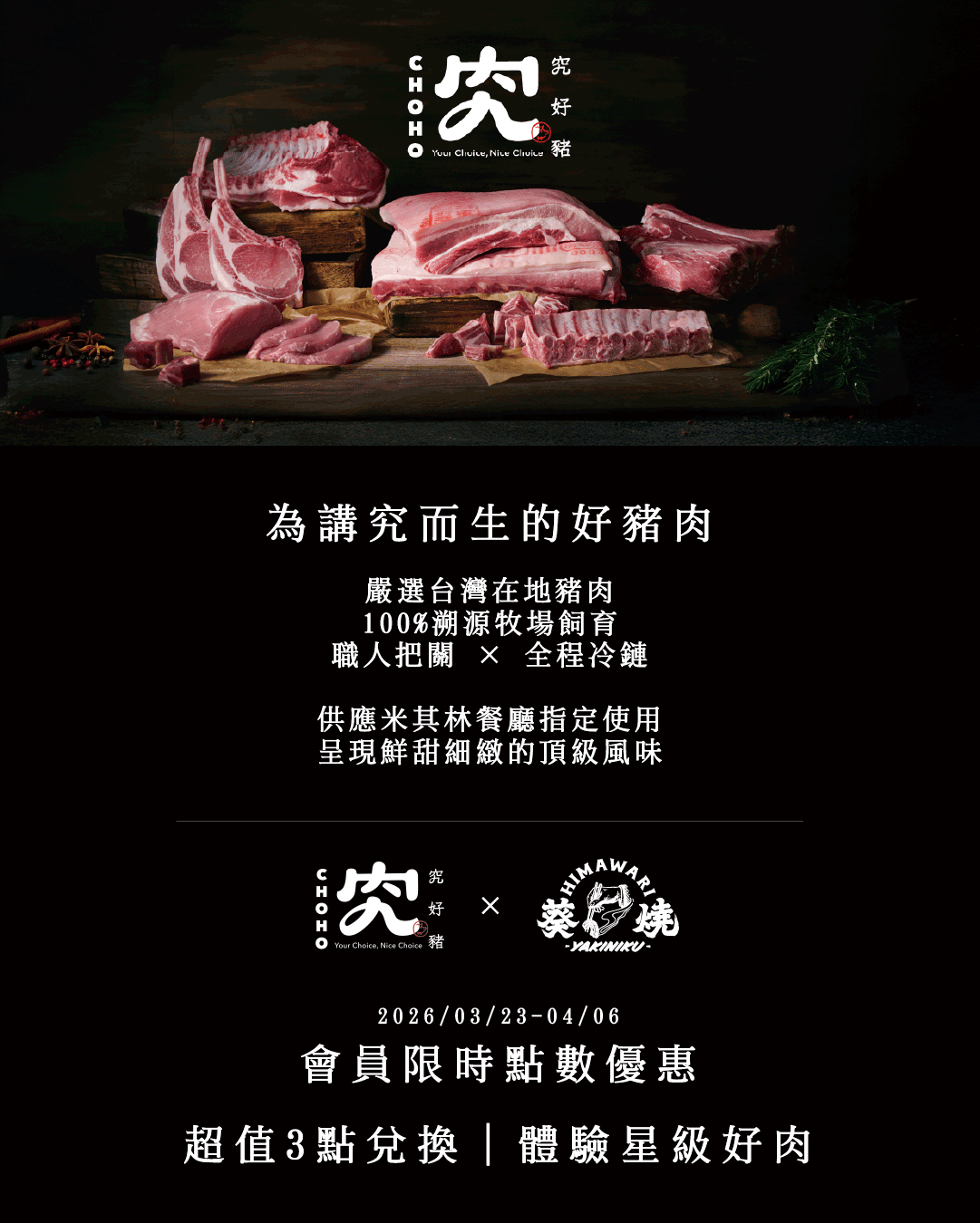 【活動資訊】 活動期間|2026/03/23 – 2026/04/06 會員使用3點即可兌換:究好豚五花 / 梅花(2選1) 每桌限兌換1份|內用限定|不得折現或外帶